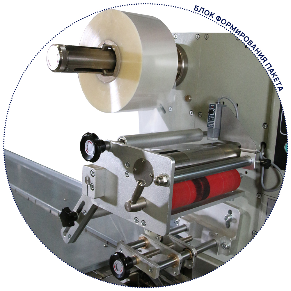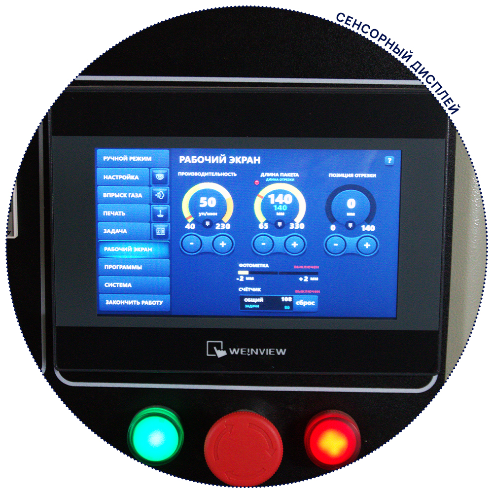 Автомат имеет верхнюю подачу пленки, высокоточный датчик фотометки, раздельный температурный контроль ТЭНов (удобно при использовании различных упаковочных материалов), механизмами легкой перенастройки ширины и длинны упаковки, русифицированный блок управления с простым и понятным интерфейсом.