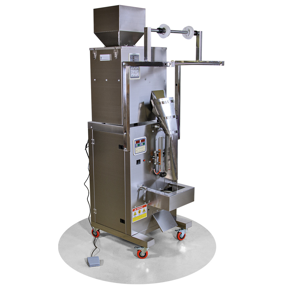 Принцип работы фасовочно-упаковочного автомата MAGIKON AVWB500IP: оператор засыпает продукт в бункер, дозатор скидывает отмеренную дозу в блок формирования упаковки, где пакет запаивается, обрезается и собирается оператором либо движется далее.